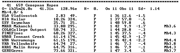 | Эпицентр взрыва (рис. 2) рассчитан по данным 11 станций. Волновые формы 5 станций ( Владивосток, Хайлар, Сеймчан, Колледж Оутпост, Теннант Крик) поступают в ГС РАН в режиме, близком к реальному времени, информация с остальных поступила в виде выделенных вступлений из международного центра CTBTO_IDC. |