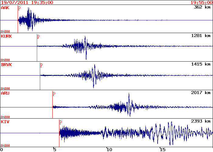 | На рис. 1 представлены фрагменты записей цифровых станций Ала Арча (∆ 3.4º), Курчатов (∆ 11.8º), Боровое (∆ 13º), Арти (∆ 18.4º), Кисловодск (∆ 21.6º). На рис. 2 представлены фрагменты записей цифровых станций Сторожевое (∆ 24.9º), Талая (∆ 25.1º), Обнинск (∆ 27.5º), Киев (∆ 31º), Калининград (∆ 36.7º). |