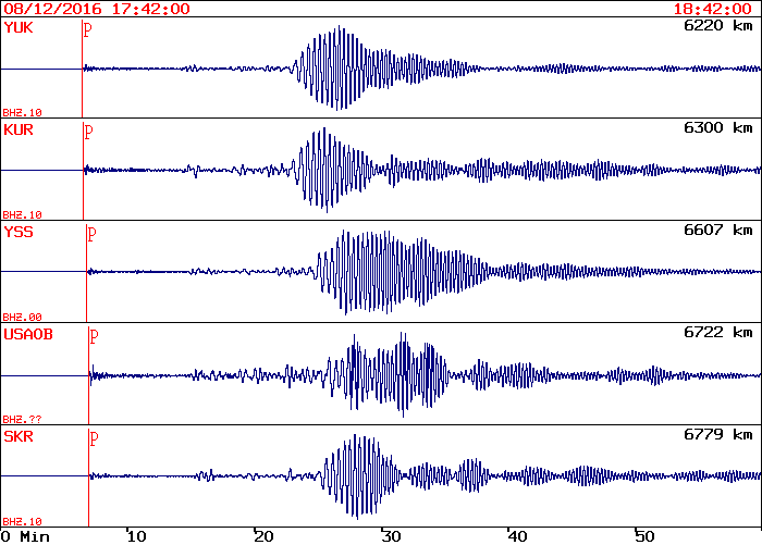 | На рис. 1 представлены фрагменты записей цифровых станций Port Moresby (∆ 14.1º), Monsavu (∆ 17.6º), Tennant Creek (∆ 27.6º), Kipapa (∆ 51º), Matsushiro (∆ 51.8º). На рис. 2 представлены фрагменты записей цифровых станций Южно-Курильск (∆ 56.2º), Курильск (∆ 56.9º), Южно-Сахалинск (∆ 59.7º), Уссурийск (∆ 60.8º), Северо-Курильск (∆ 61.2º). |