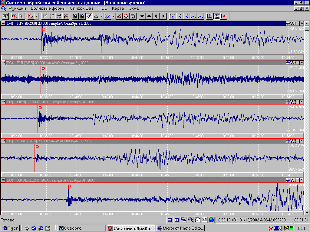 | На рис. 1 приведены фрагменты записей вертикальной компоненты (BHZ) цифровых станций, поступивших в ИОЦ в режиме, близком к реальному времени: Kongberg, Норвегия (дельта 18 градусов), Обнинск (дельта 19 градусов), Пулково (дельта 20 градусов), Кисловодск (дельта 20 градусов), Арти (дельта 22 градуса). На рис. 2 - записи вертикальной компоненты (BHZ) цифровых станций: Талая (дельта 58 градусов), Ulan-Bator, Монголия (дельта 61 градус), Билибино (дельта 69 градусов), Магадан (дельта 72 градуса), Южно-Сахалинск (дельта 80 градусов). |
