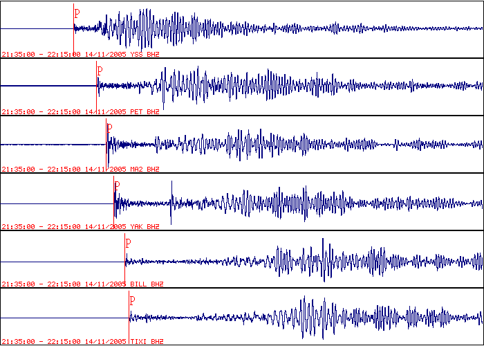 | 14 ноября 2005 года у Восточного побережья Хонсю, Япония, произошло ощутимое землетрясение в 21 час 38 мин по Гринвичу с магнитудой М=7.1. Эпицентр находился 350 км восточнее Синдай и около 535 км на северо-восток от столицы Японии -Токио. Землетрясение ощущалось в ряде городов северо-восточной части о-ва Хонсю. Землетрясение вызвало умеренные по амплитуде волны цунами. |