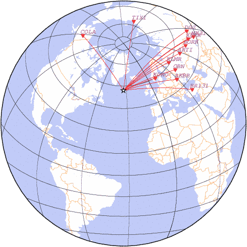 Параметры землетрясения в районе Хребет Рейкьянес, время 2025-10-12 18:27:48, широта 57.00, долгота -33.60, глубина 10 км, mb: 4.8/11 рассчитаны по станциям:
