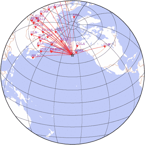 Параметры землетрясения в районе Полуостров Аляска, время 2025-10-23 16:27:55, широта 54.65, долгота -160.19, глубина 50 км, mb: 4.6/29 рассчитаны по станциям: