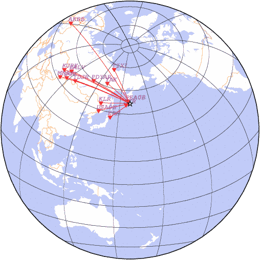 Параметры землетрясения в районе РЈ восточного побережья Камчатки, время 2025-11-08 12:51:56, широта 51.56, долгота 159.99, глубина 20 км, mb: 4.3/8 рассчитаны по станциям: