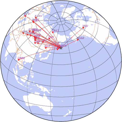 Параметры землетрясения в районе РЈ восточного побережья Камчатки, время 2025-12-25 19:30:26, широта 52.45, долгота 163.60, глубина 33 км, mb: 4.8/19 рассчитаны по станциям: