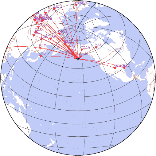 Параметры землетрясения в районе Южнее Аляски, время 2025-12-25 23:38:06, широта 55.07, долгота -156.97, глубина 10 км, mb: 4.6/22 рассчитаны по станциям: