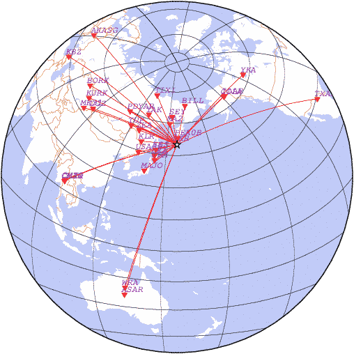 Параметры землетрясения в районе Восточнее Курильских островов, время 2026-01-02 15:17:37, широта 49.94, долгота 157.13, глубина 33 км, mb: 4.3/11 рассчитаны по станциям: