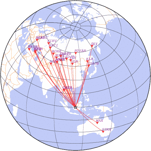 Параметры землетрясения в районе Борнео, время 2026-01-23 07:47:55, широта -0.12, долгота 111.95, глубина 10 км, mb: 5.0/21 рассчитаны по станциям: