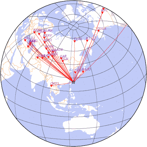 Параметры землетрясения в районе Северо-восточнее Тайваня, время 2026-03-02 04:56:27, широта 25.29, долгота 124.88, глубина 10 км, mb: 5.2/24 рассчитаны по станциям: