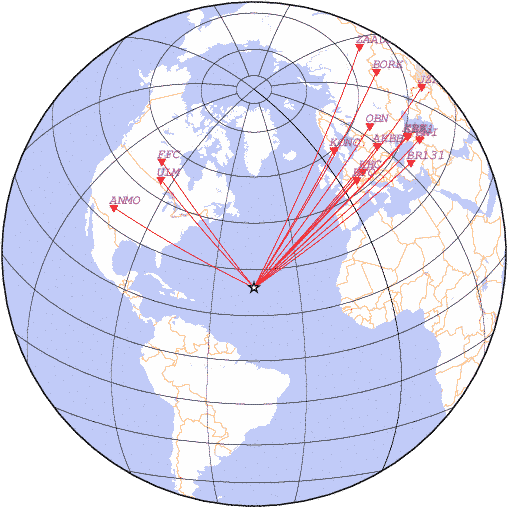 Параметры землетрясения в районе Север Срединно-Атлантического xребта, время 2026-03-23 01:41:39, широта 24.12, долгота -45.80, глубина 10 км, mb: 5.1/13 рассчитаны по станциям: