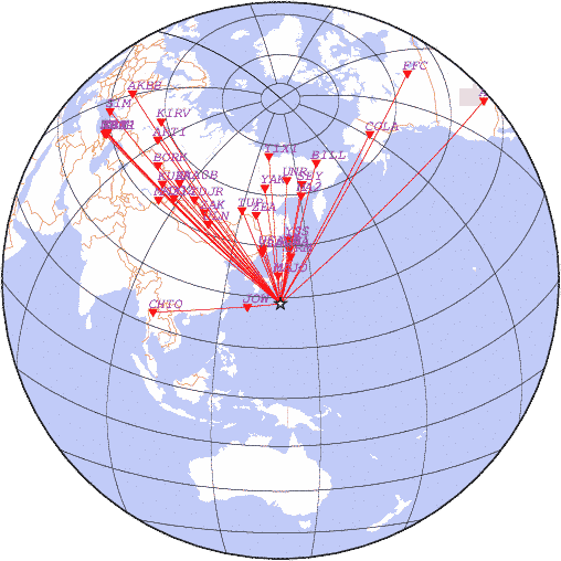 Параметры землетрясения в районе Район островов Бонин, РЇРїРѕРЅРёСЏ, время 2026-03-28 08:58:42, широта 28.19, долгота 139.09, глубина 520 км, mb: 4.5/27 рассчитаны по станциям: