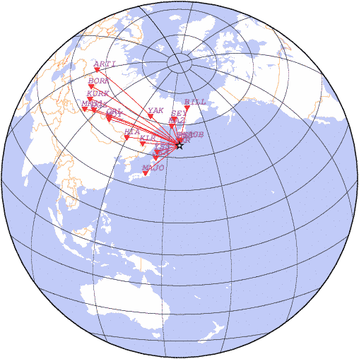 Параметры землетрясения в районе Курильские острова, время 2026-04-21 02:13:48, широта 50.52, долгота 157.64, глубина 45 км, mb: 4.2/10 рассчитаны по станциям: