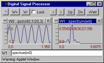 Digital Signal Processor (DSP) is a digital signal processing Java applet designed upon principle integration formulas, signal data set and their graphical presentations. Originally this module was developed as a part of seismic data processing system WSG for Windows 9x/NT/ME/2000/XP and was written in Microsoft Visual C++. Window formulas are the kernel of DSP: any window can contain a formula defining its contents. This formula can reference signal in other Windows, incorporate mathematical functions, and generate signals. In some cases this program is similar to the DADiSP software package. Current version of DSP support up to 16 windows. Also 8 graphics may be overloaded on to the current window.